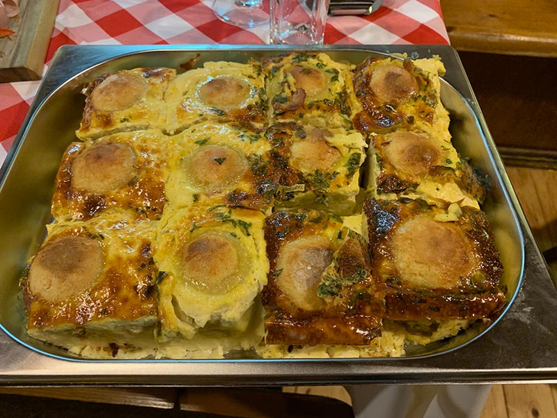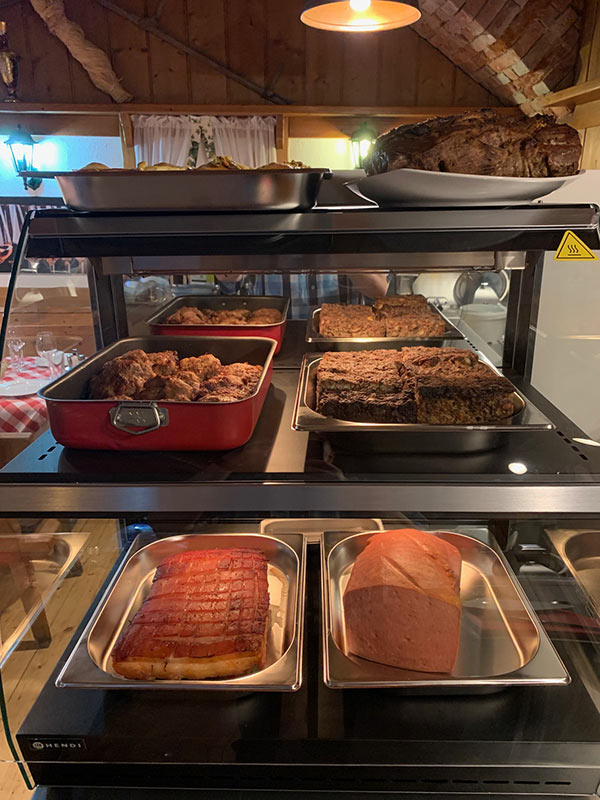 gemischter Bauernspeck, Surbauch, Schopfbraten mit Erdäpfelkas, fein garniert